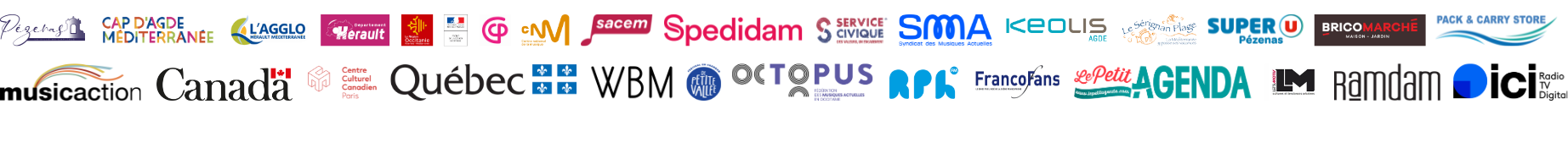 Ces rencontres sont réalisées avec le soutien et le partenariat de Musicaction et le Gouvernement du Canada, Le Centre Culturel Canadien, La Délégation Générale du Québec à Paris, La Ville de Pézenas, Wallonie Bruxelles Musique, Occitanie en scène, Fédéchanson, Octopus, Chateau Laurens – Ville d’Agde, Village en Chanson de Petite Vallée, Ruel Tourneur.